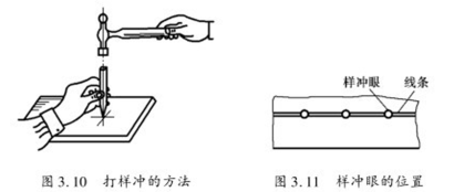 (1)沖眼時,將樣沖斜放在劃線上,錘擊前再豎直,以保證沖眼的位置正確,如圖3. 10所示。