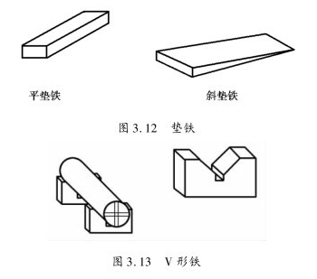 支承工具有墊鐵(如圖3. 12所示)、V形鐵(如圖3. 13所 示)、方箱、角鐵、千斤頂?shù)取?/span>