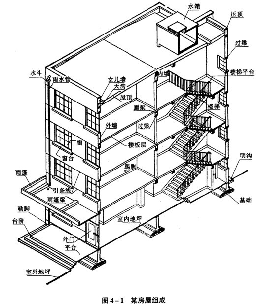 房屋也稱為建筑物,大致分為民用建筑、工業(yè)建筑和農(nóng)業(yè)建筑。圖4- 1為一接四層招待所的一部分,這幢房屋是鋼筋混凝土構(gòu)件和磚墻承重的混合結(jié)構(gòu)。鋼筋混凝土基礎(chǔ)承受上部荷載并傳遞到地基;內(nèi)外墻起著承重、維護(hù)和分隔等作用;有分隔上下層的樓板(又稱樓蓋)和垂直交通聯(lián)系的樓梯;屋頂(又稱屋蓋)設(shè)有屋面板,板上做有保溫、隔熱層和防水層, 為上部維護(hù)結(jié)構(gòu);房屋的內(nèi)外墻上設(shè)有不同型號的門和窗。此外,房屋的右側(cè)設(shè)有陽臺;左側(cè)底層的出人口設(shè)有雨蓬、臺階;內(nèi)外墻做有內(nèi)外粉刷以及踢腳、墻裙、勒腳等;還有雨水管、 明溝、裝飾性的花臺、花格等等。